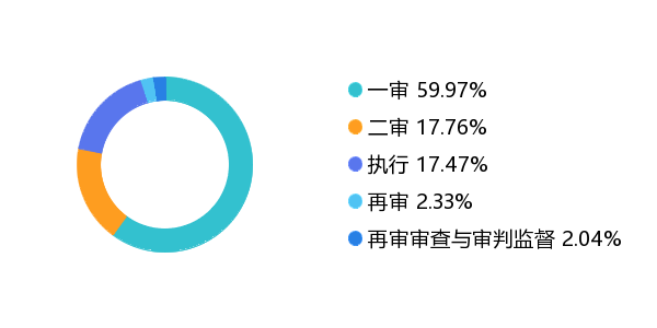 (七)从下面的程序分类统计可以看到当前的审理程序分布状况。一审案件占比59.97%,二审案件占比17.76%,执行案件占比17.47%,再审案件占比2.33%,再审审查与审判监督案件占比2.04%。