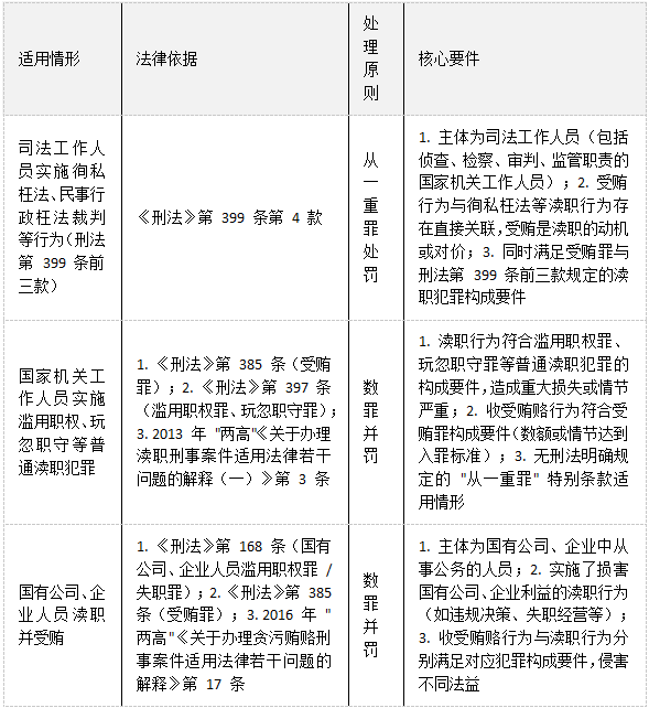 1.刑法基础条款:刑法第 385 条明确受贿罪构成要件,国家工作人员利用职务上的便利,索取他人财物或非法收受他人财物为他人谋取利益即构成本罪;第 397 条规定滥用职权罪、玩忽职守罪,国家机关工作人员滥用职权或玩忽职守致使公共利益遭受重大损失需承担刑事责任;第 399 条第 4 款作出特别规定,司法工作人员收受贿赂同时实施徇私枉法等行为的,依照处罚较重的规定定罪处罚。
