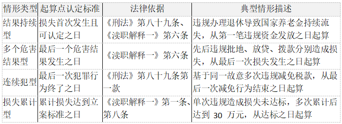 程某违规办理退休案(最高人民检察院发布典型案例):2003 年 7 月程某违规为 11 人办理退休,2003 年 12 月起国家开始发放违规退休金,2015 年案发。法院认定追诉时效应从 2003 年 12 月(损失首次发生之日)起算,而非 2003 年 7 月(行为实施日)或 2015 年(案发日),明确了结果持续型案件的起算规则。