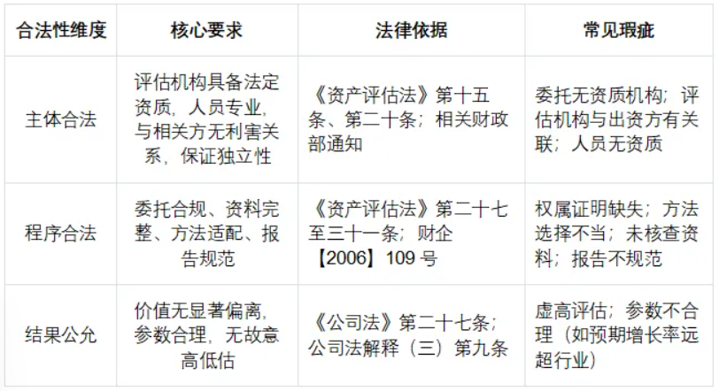结合法律规定及司法实践,知识产权出资评估价值的合法性,需同时满足“主体合法、程序合法、结果公允”三大维度,任一维度存在瑕疵,均可能导致评估价值不被法律认可。