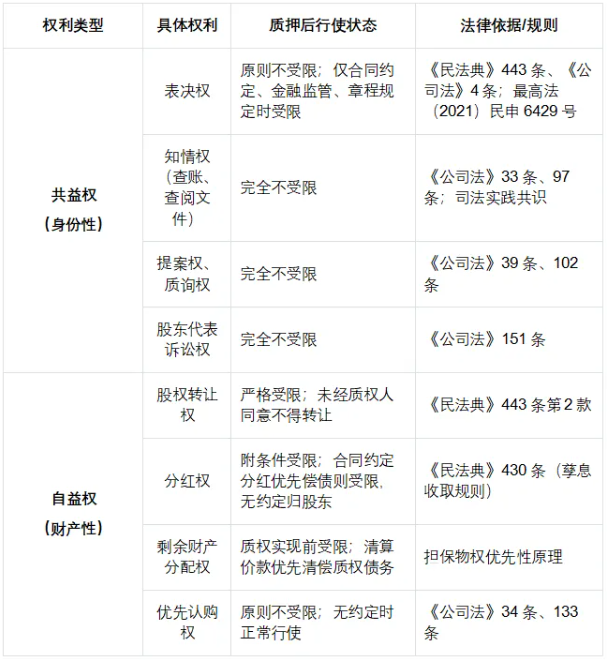 为清晰区分股权质押下各类股东权利的行使状态,特整理如下对比表: