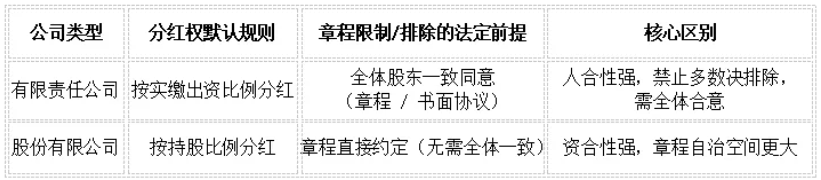 非上市 / 上市股份公司章程明确 “类别股不分红、优先股固定分红”,不违反强制法与监管规则,有效。上市公司受《上市公司治理准则》第七条约束:章程不得剥夺股东法定权利,限制需合理、披露充分。