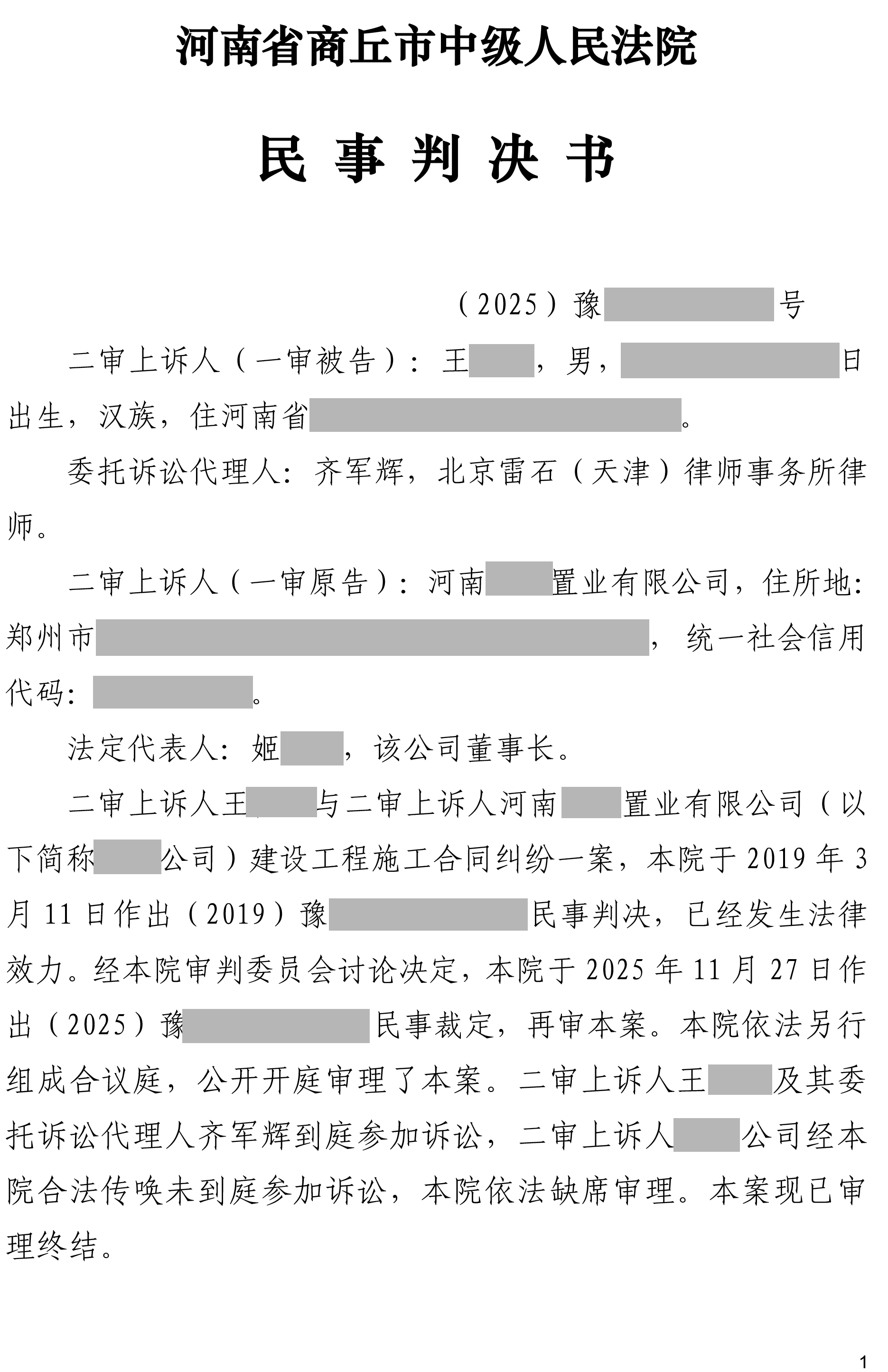 近日,河南省商丘市中级人民法院就河南某置业有限公司与王先生建设工程施工合同纠纷再审一案作出判决。雷石律所谭伟主任、王赛律师、齐军辉律师接受再审申请人王先生的委托,凭借深厚的法律专业素养、严谨的案件梳理能力及精准的诉讼策略,成功助力当事人实现核心诉求——法院依法撤销原一、二审判决,驳回某置业公司的全部实体诉讼请求,充分维护了当事人的合法权益。